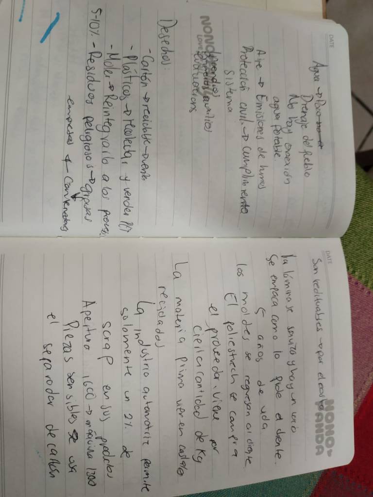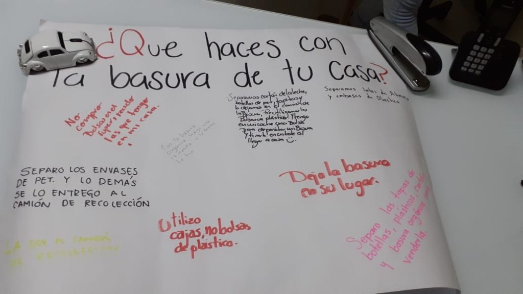- Al terminar del recorrido por las naves, regresamos a las oficinas de los trabajadores y practicantes, en este momento nos ofrecieron un recorrido por las instalaciones mostrándonos así el comedor, la sala de juntas y la oficina del gerente y la del jefe. Al estar en el comedor colocamos una “Grafitti Wall”(Método que en el que los participantes pueden ofrecer sus comentarios libremente, estos comentarios pueden ser directamente en el contexto que se necesite.(Martin,2012)) con la pregunta “¿Qué haces con la basura de tu casa?”. La razón de este ejercicio es la siguiente: durante el recorrido observamos que la empresa promovía el reciclaje, por lo que queríamos ver que tanto había impactado su campaña dentro de los trabajadores.