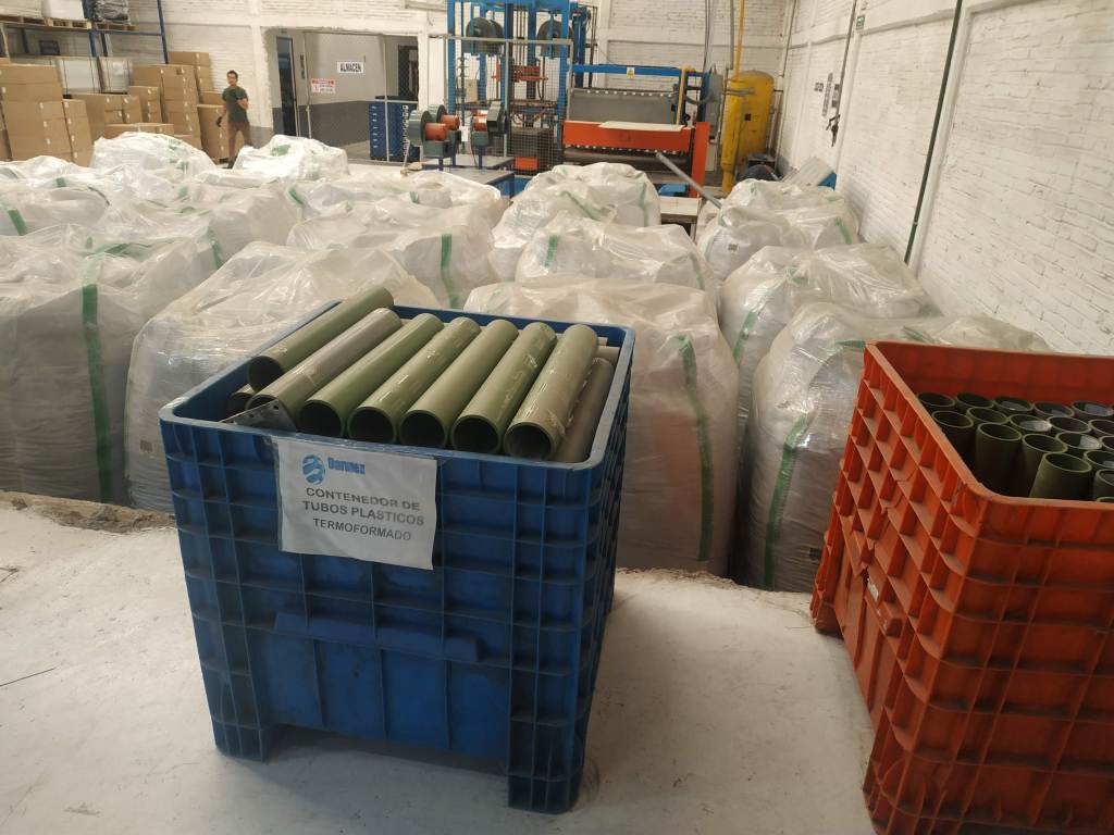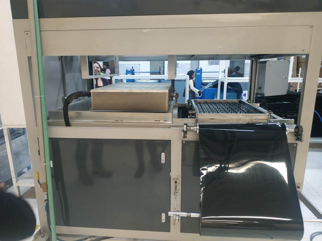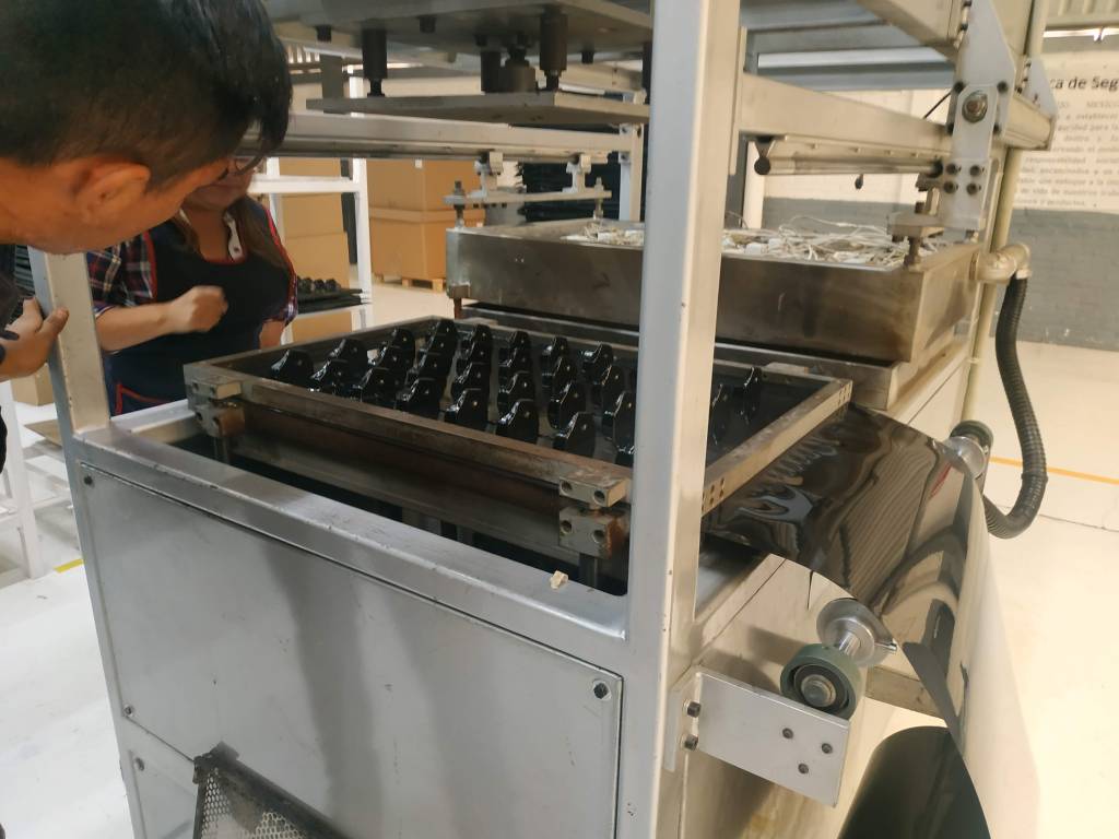 - Al terminar el proceso de Flocking pasamos al siguiente: Termoformado. Dentro de este proceso se utilizan láminas delgadas de plástico que se van introduciendo a la maquinaria. Éstas forman las piezas con moldes de metal como base. Una vez formada la pieza, se cortan las láminas con rodillos y cuchillas en una plancha, al terminar son selladas en bolsas plásticas. Los residuos son enviados a los molinos para ser reutilizados.