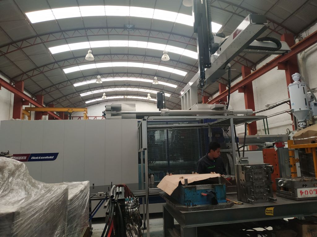 - En la siguiente nave se encontraba la maquinaria del tercer y último proceso: Inyección. Durante este proceso pudimos observar la maquinaria más grande de la empresa, ésta era principalmente de luz al principio pero fue remplazada por híbridas pues el trabajo es el mismo pero los costos disminuyen y la velocidad aumenta. En el proceso se crean piezas de diferentes tamaños, principalmente pequeñas como los tapones de los automóviles. Al recordar estas piezas que salen en cadena de las máquinas, todo el material no utilizado se envía a los molinos. Aquí se utiliza agua para enfriar el material, este líquido corre por unos tubos a lo alto de la nave, y no es necesario desecharla frecuentemente, solamente rellenar la que se haya vaporizado. Aquí también se crean algunos desechos químicos que permiten que el agua no se apeste o oxide la maquinaria, sin embargo, estos residuos son entregados a un proveedor especial.